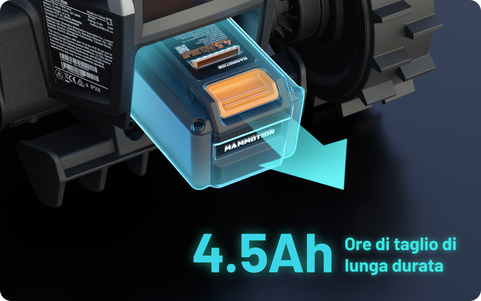 YUKA mini Vision è dotato di una batteria rimovibile da 4,5 Ah, che garantisce un'autonomia di taglio prolungata. Sostituisci facilmente le batterie per mantenere il tuo rasaerba in funzione senza interruzioni.