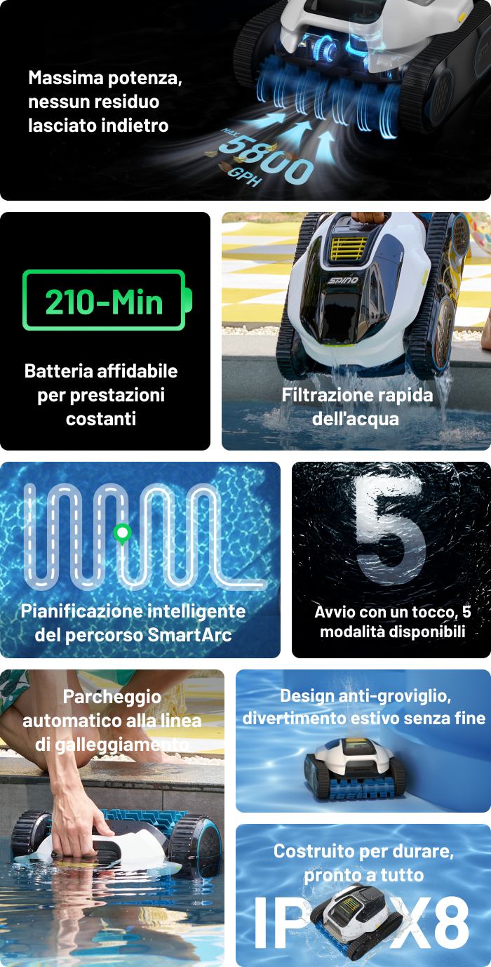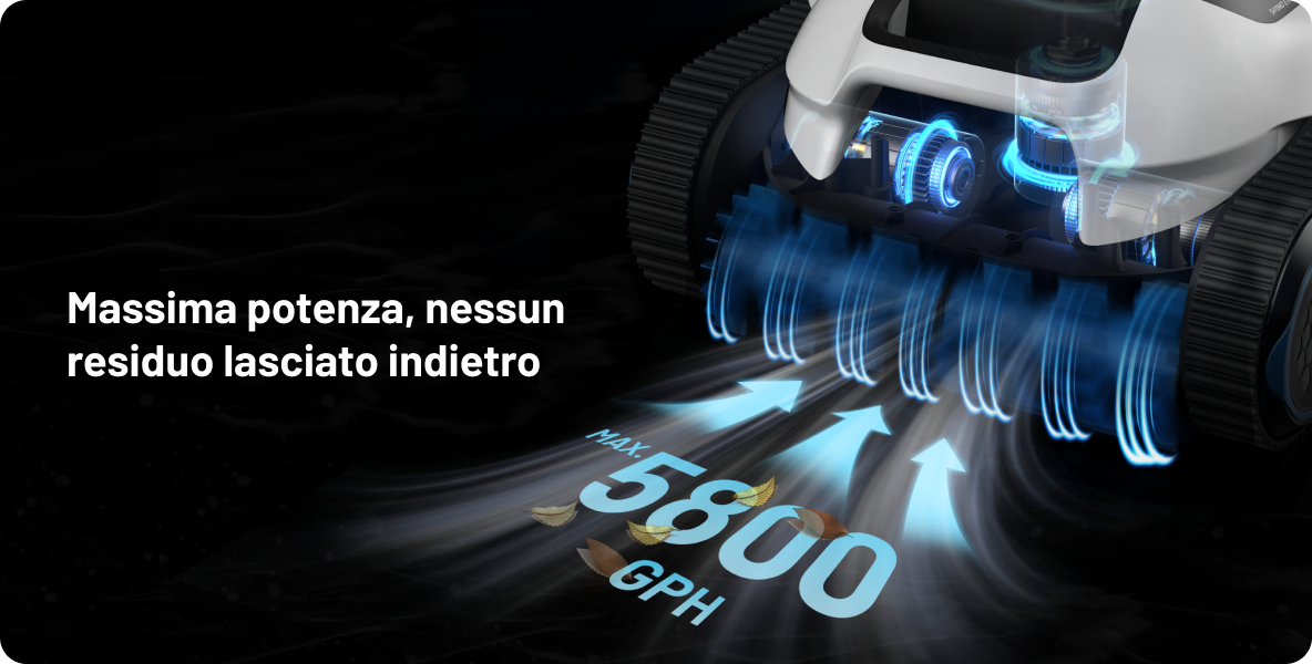 Aspirazione di 5200 GPH per una pulizia intensiva (attivare dopo le modalità Pavimento/Muro, esclusivo per l’app)